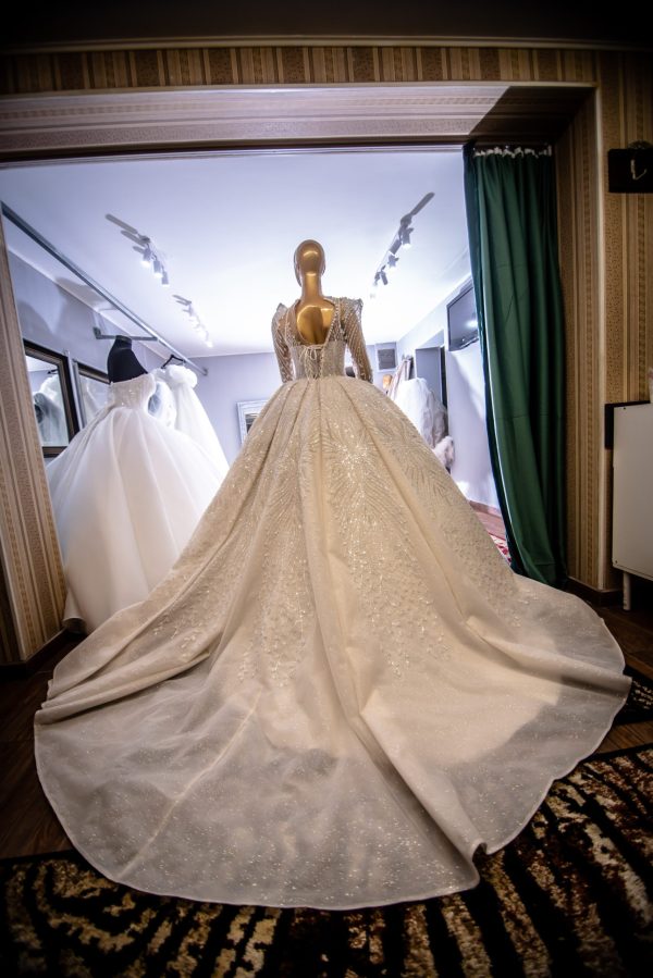 Transformă-ți ziua cea mare într-o adevărată poveste de basm cu această rochie de mireasă impresionantă, creată să exprime regalitate, rafinament și lux absolut. Această capodoperă vestimentară îmbină măiestria artizanală cu un design inovator, oferind fiecărei mirese șansa de a străluci precum o adevărată regină. Corsetul spectaculos este realizat din broderii delicate, îmbogățite cu mii de mărgele și perle aplicate manual, creând un efect tridimensional care captează lumina din orice unghi. Decolteul elegant în formă de inimă este completat de un strat fin de tulle brodat, ce oferă un aer sofisticat și romantic, în timp ce mânecile lungi adaugă un plus de eleganță și rafinament.