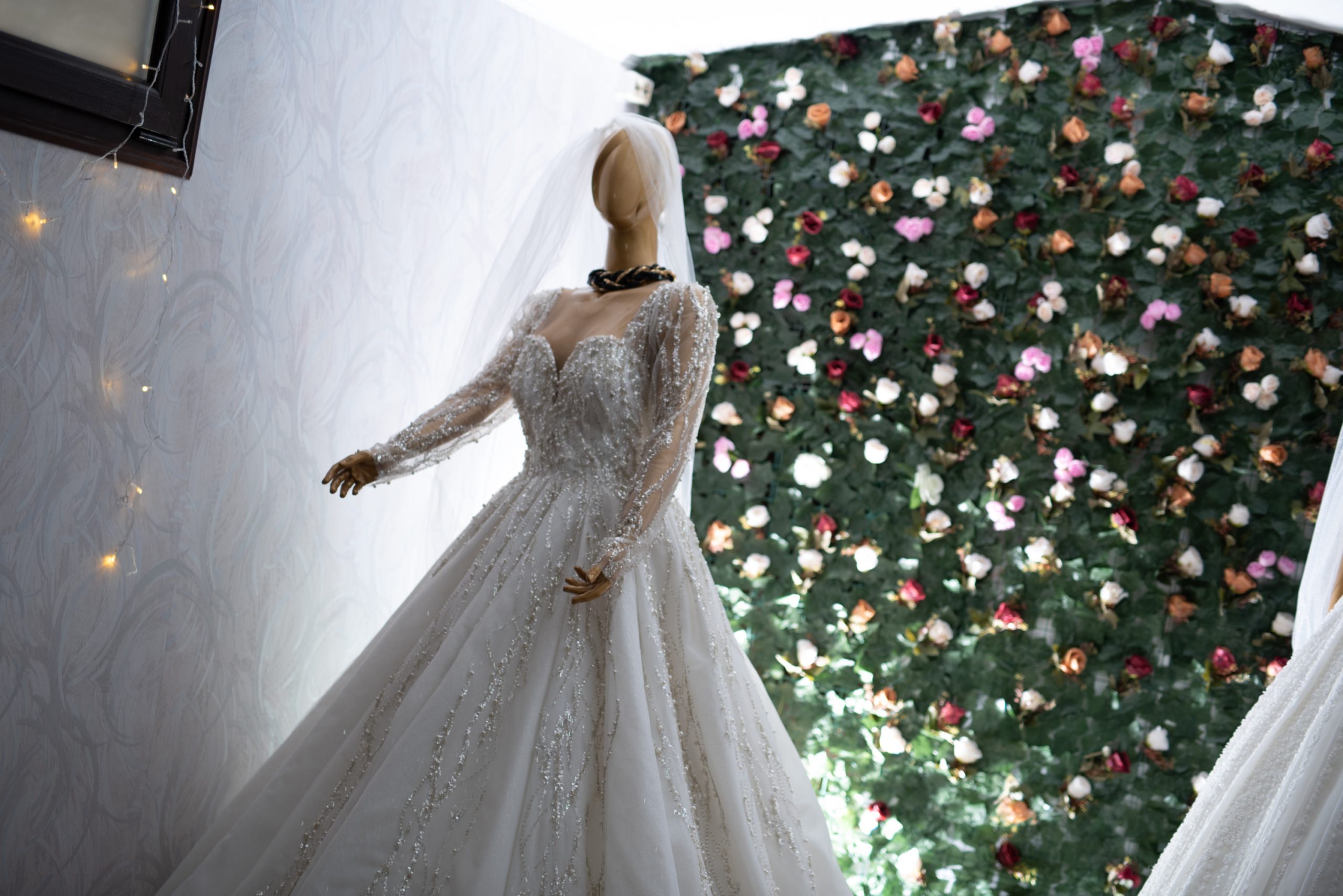 Mânecile lungi din tulle transparent, decorate cu broderii fine și aplicații delicate, conferă o eleganță atemporală, iar decolteul în inimă adaugă un plus de romantism și delicatețe. Fusta amplă, de tip prințesă, creează un efect spectaculos prin straturile sale vaporoase și broderia atent realizată, ce se extinde în detalii florale pe întreaga suprafață.