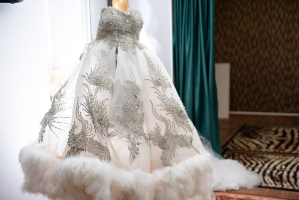 Confecționată din straturi delicate de materiale fine, fusta amplă a rochiei emană un aer regal, fiind decorată cu broderii realizate manual, cu un design inspirat de frumusețea cosmică a stelelor. Aplicațiile din mărgele și cristale sclipitoare, dispuse într-un model complex și armonios, creează un joc de lumini fermecător la fiecare pas, reflectând subtilitatea și grația mișcărilor miresei. Marginea fustei este accentuată cu blană albă moale, adăugând o notă dramatică și un contrast textural ce amplifică efectul vizual al întregului ansamblu.